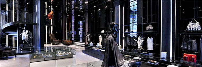 空間立面使用黑色鏡面,加深場景域圍塑的安全感,設計師透過燈光鋪陳深化空間的戲劇性,以藍、紅、白等光襯托空間,讓重點光束投射于展示品。在深色調(diào)中,設計師條配多種層次的光澤度,襯托物建的別致作工與價值,高低錯落的中島展示柜集墨鏡、深色皮革等材質(zhì)變化。