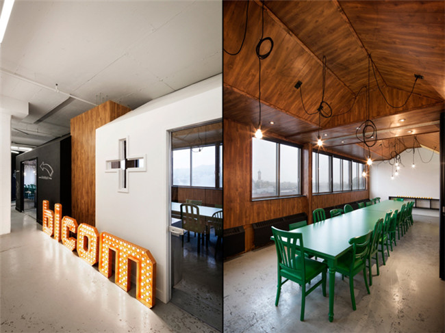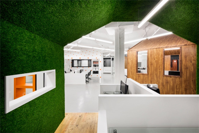 小房間另類的鄉(xiāng)村風格成為了它的靈感來源,小房間經(jīng)常會喚起湖邊童年暑假以及營火的記憶,為什么不能擁有一個創(chuàng)造快樂回憶的辦公室?將墻壁和天花板都處理成了白色但是小房間依然保留了他們的視覺樣式,不論是假草、木隔板或者橙色的斑點。