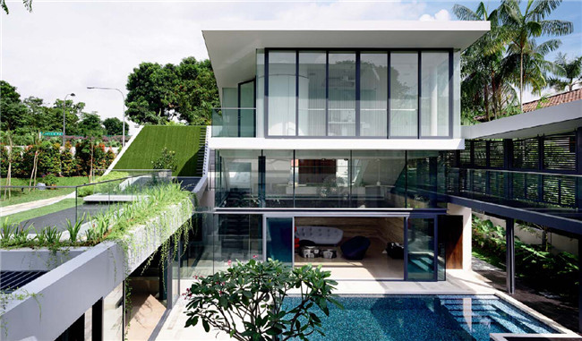 文章導(dǎo)讀:私密性是這棟別墅豪宅的設(shè)計(jì)重點(diǎn)。建筑師利用幾個(gè)覆蓋著草皮的折疊屋頂,將它從公路的喧囂中隔離,起伏的地形也得到巧妙化解:低于街面的地下一層擁有一個(gè)大泳池,由此為居住空間增添了清涼與私密。