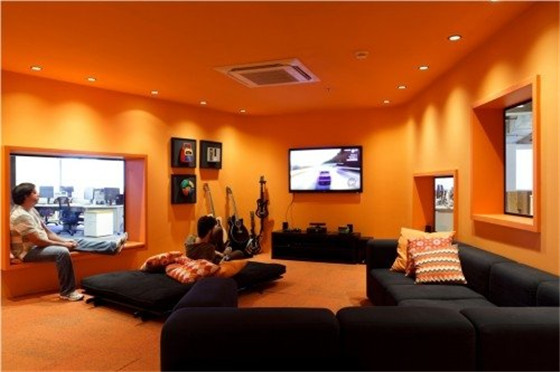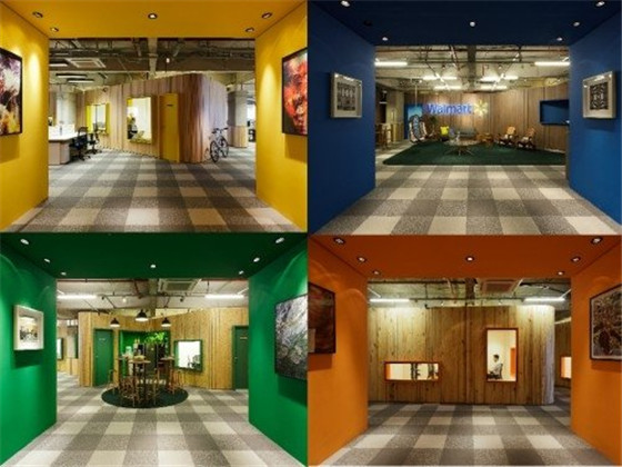 各個部門分布在不同的樓層,為了便于員工和訪客的確定區(qū)域,設(shè)計師每層的在中心地帶設(shè)計一個獨(dú)特的識別空間,打破空間垂直方向上的呆板。作為重要的空間組成,每層都有休息室和減壓空間。設(shè)計師希望通過這些休閑區(qū)域,增加不同員工部門的互動交流,為他們增加思維活力。為了確??臻g的連貫,休閑空間都有相似的設(shè)計語言,并分別選擇了沃爾瑪?shù)墓俜缴S色、綠色、藍(lán)色、橙色、作為每層的主打顏色。