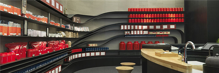 黑鐵展示架、泡茶臺與實木品茶桌、實木展示座、手打石材效果的地面材質(zhì)及服務(wù)柜臺外觀,從不同的視角及材料細節(jié)呼應(yīng)制茶過程的手作特質(zhì)與細膩執(zhí)著。
