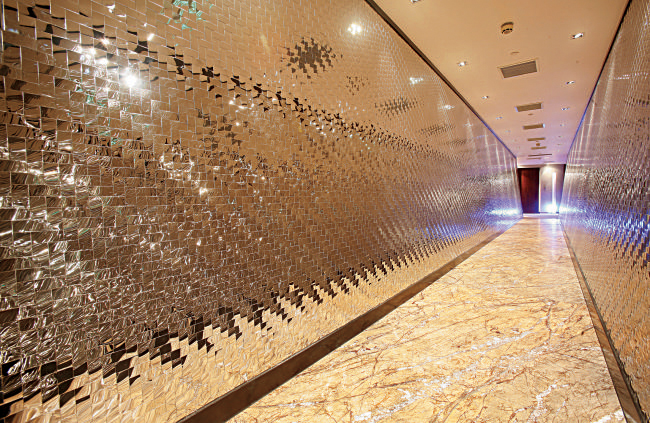 文章導(dǎo)讀:本項目坐落于上海市的繁華地段——淮海路瑞安廣場,是上海酒店投資、數(shù)邦科技及基匯投資三家公司的上海代表處。三個截然不同的公司、不同的辦公空間、不同的形式風(fēng)格,需要一種強烈的設(shè)計要素來整合它們。長長的鋪滿大理石的走道在鑲滿不銹鋼圖案墻的映照下熠熠生輝,它是整個項目的閃耀點,強烈地影響了這里所有的辦公空間。