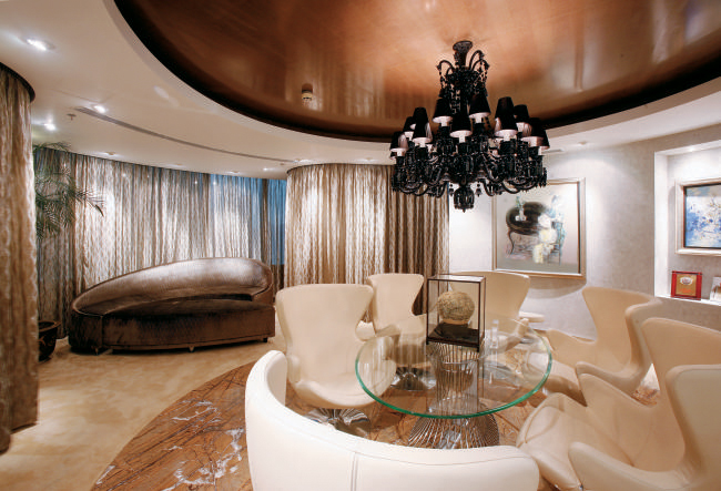 走道通往奢華的Mr.Leo辦公室,這是一個集合辦公、非正式會客和放松的場所。四周的墻體由意大利特制灰泥粉刷,圍繞著中間一張獨具匠心設(shè)計的玻璃會議桌,地面鋪設(shè)著與走道相同的花紋奇特的大理石,天花則是木膠合板拼接,懸掛著黑色水晶大吊燈。從窗戶往外觀望,可以欣賞到上海最好的繁榮美景。窗下定制的可組合沙發(fā)具備多項功能。另一邊,由窗簾分隔的是一個放松的區(qū)域和和私人使用的盥洗室。