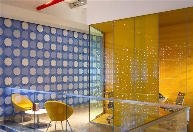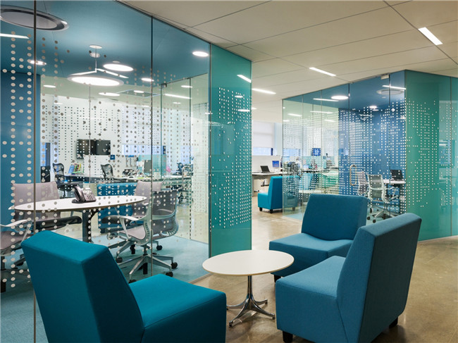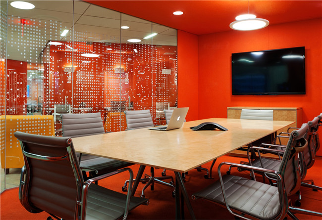 南北兩邊都是開放式的辦公室設(shè)計(jì)區(qū)域,每個(gè)區(qū)域都有其特定的顏色,由多面的玻璃體塊構(gòu)成的框架,提供私人會(huì)議室和小型的對(duì)話亭??梢酝ㄟ^不同的路到達(dá)指定地點(diǎn),建立一些緊湊或者放松的空間。
