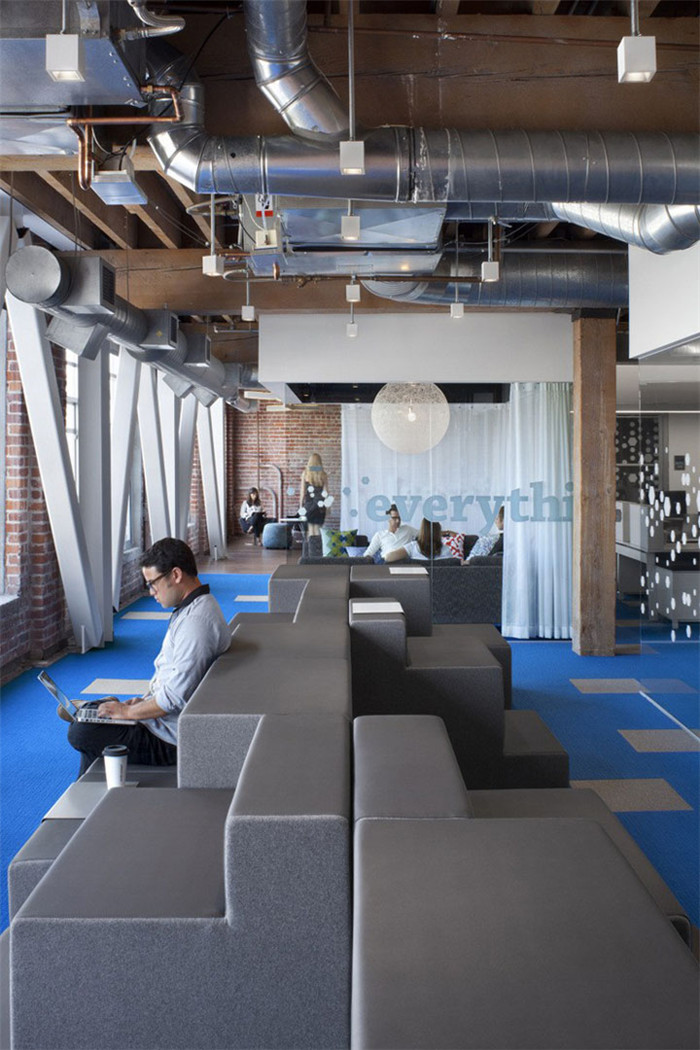 進入辦公室,就會被大廳里又長又窄的醒目的Adobe 標志吸引,一面定制的logo圖形雕刻隔屏界定了大廳多功能空間——會議、發(fā)布、洽談、演講等。新的界面設(shè)計讓辦公室別有風味,時尚的色彩和肌理與古典的磚木建筑形成強烈的反差。