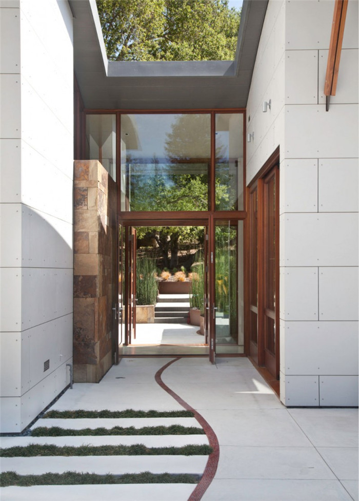 別墅的存在不僅沒有破壞周圍的自然環(huán)境,反而有益于保存和優(yōu)化橡樹林和小溪的生存條件。別墅由玻璃走道和拱頂相連,還有庭院和室外空間將別墅與周圍的美景融為一體。小路南邊盡頭有一個雕塑平臺,而其設(shè)計靈感便來自于小溪。室內(nèi)拱形天花板處還有青銅板拱腹。