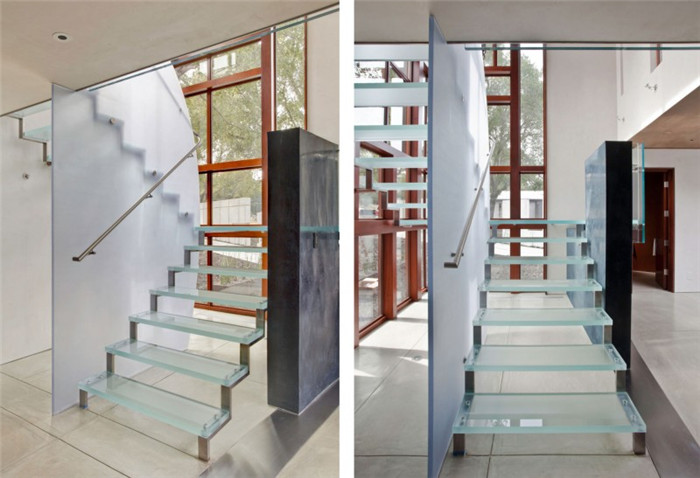 設(shè)計師們還在別墅中央設(shè)計了獨特的、獨立玻璃臺階連接別墅的上下兩層。室內(nèi)白色水泥墻面為別墅增加了明亮的光線。鍍鋅屋頂和定做的木窗將室內(nèi)裝飾很有特點。天然石材,混凝土,石膏,青銅,深色硬木材等材料構(gòu)成了整個別墅建筑,和諧地共存。別墅室內(nèi)裝飾的細(xì)節(jié)也同樣精彩。