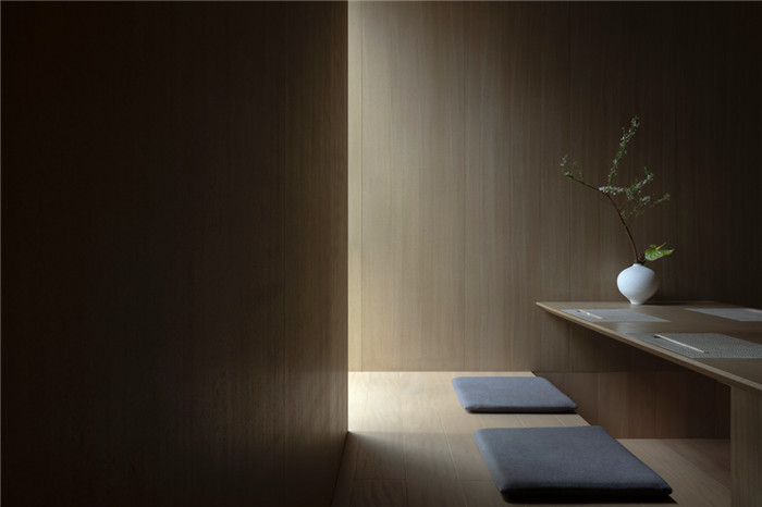 植藤·匠餐廳設(shè)計(jì)空間運(yùn)用不同的材質(zhì)及氛圍,在空氣、水等介質(zhì)中詮釋著矛盾交融的美感。柔和的是色彩、燈光,或者光線的過度,呈現(xiàn)出溫潤而又理想型的舒適感;厚重的是材料、紋理,以及它天然的質(zhì)感,融合了現(xiàn)代的超然和傳統(tǒng)的細(xì)膩,用溫柔的姿態(tài)回應(yīng)粗獷簡潔的構(gòu)造。淡然的色調(diào)輕盈而縹緲,讓就餐前的每一個步伐都充滿了故事性,每一個場景都加劇著情感的層層遞進(jìn),每一處看似稀松平常的角落都隱藏著美麗的線條和微妙的復(fù)雜性。