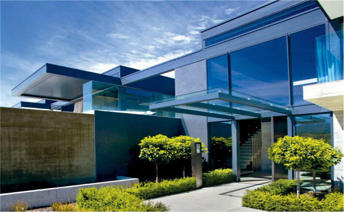 室內(nèi)延續(xù)著種類似的色調(diào),不過比起室外設(shè)計的流暢,此處顯得更為粗制。拋光混凝土、隱隱發(fā)光的不銹鋼材料及玻璃在室內(nèi)起到了主導的作用。開放式客廳、餐廳及廚房區(qū)域潢跨這幢房屋,位于人口門廳的左側(cè),而主臥套間及書房則位于其后方。右側(cè)是間賓客大堂、兩間臥室和一間健身房。