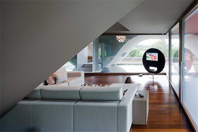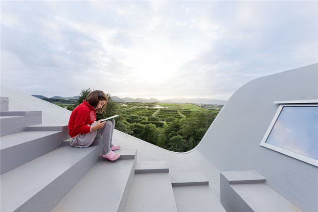 頂層的臥室被設(shè)計(jì)的更具維合感和保護(hù)性,它被包含在實(shí)心立方體中,并有選擇的向周邊景觀開放。屋頂上則設(shè)計(jì)了一個(gè)階梯式的彎曲平臺(tái),它為居住者提供了一個(gè)無障礙的觀景角度,可以縱覽小島北海岸的美景。