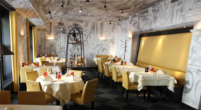 這般藝術(shù)氣息也體現(xiàn)在一樓的酒店餐廳。餐廳四壁布滿當(dāng)代畫作,十分醒目。如此酒店餐廳設(shè)計讓食客如身臨其境,仿佛在舞臺正中央,被歌劇演員與觀眾包圍。