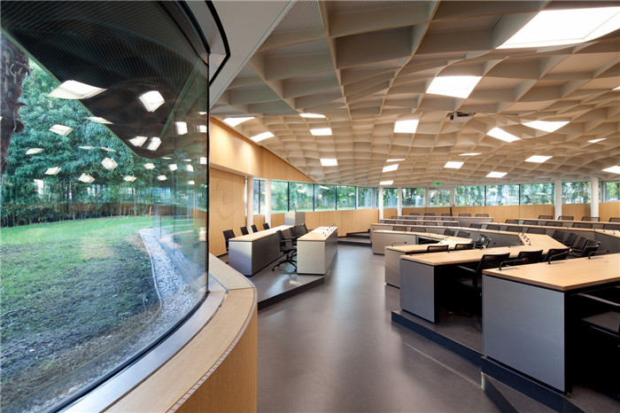 酒店選址謹(jǐn)慎考究,從樹木的邊線進(jìn)行規(guī)劃,以保酒店構(gòu)造設(shè)計(jì)避免破壞周圍植被和自然環(huán)境。禮堂的天花板采用了木質(zhì)材料,在其中有一些微小的孔,這些小孔可以起到保證音效的作用。另外還有一些專用設(shè)備,如:揚(yáng)聲器,閃光燈、錄音設(shè)備和投影設(shè)備等。