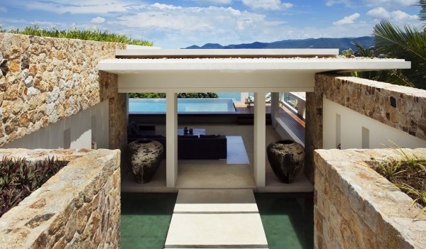 別墅起居室與外界完全沒有阻隔,俯瞰無邊界泳池。下雨時(shí),有像船帆一樣的薄板可從天花板上放下。家具和裝飾都是室內(nèi)外皆適用的。別墅設(shè)計(jì)使空氣對(duì)流自如,涼爽且節(jié)能。據(jù)介紹,別墅并沒有進(jìn)行過多的裝飾,或擺放太多的家具。寬敞、通風(fēng)的空間更利于欣賞美景,享受微風(fēng),接近自然。別墅的許多建材都取自當(dāng)?shù)?,并由?dāng)?shù)毓そ称龀?。外墻的石頭是在別墅原址上挖出來的。