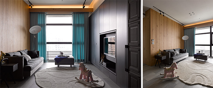 沉穩(wěn)的黑色系統(tǒng),結(jié)合了鞋柜、收納柜、書柜、電視柜,在內(nèi)斂穩(wěn)定之中,收藏起現(xiàn)代生活的現(xiàn)實面,看似一言以蔽之的黑色中,通過門片、壁紙間的材質(zhì)轉(zhuǎn)換,也能輕松刻劃出視覺外的新觸覺體驗。